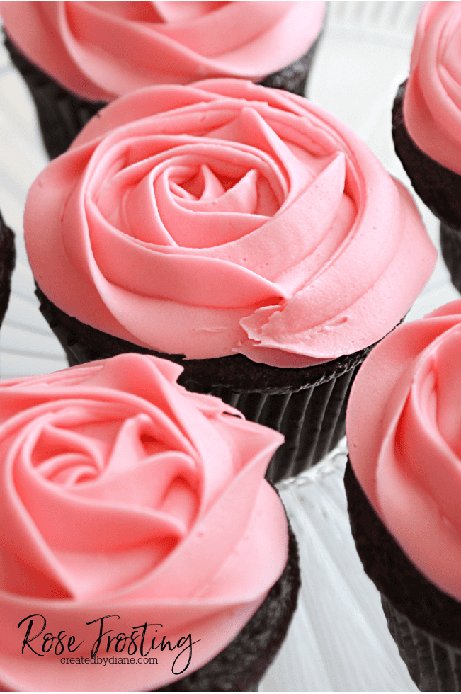 Rose frosting looks good in so many colors you’ll have to give your favorite color a try and looks great on vanilla cupcakes or chocolate cupcakes! The recipe for this smooth silky American Buttercream Frosting is in the recipe card below.