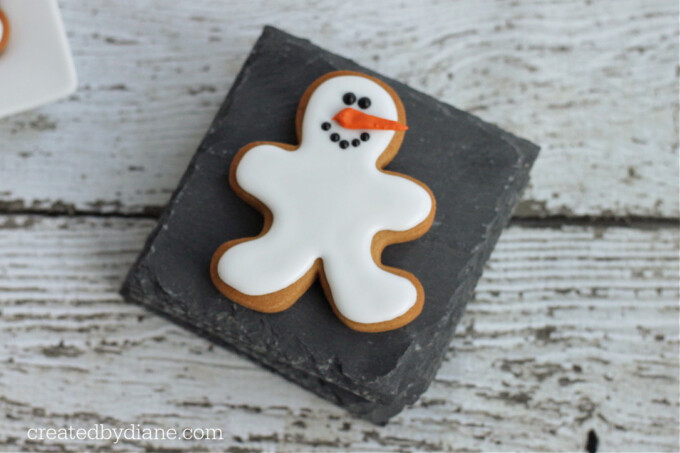 I made the orange noses so that I had them for some SNOWMAN CUPCAKES and these, so if you have a chance to make the noses ahead of time, they will dry nice so you can transfer them. If you want you can pipe the noses onto the cookies, I wanted Big FUNNY Noses so piping them onto wax paper worked great. Instructions for making royal icing details are here.