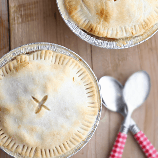 - I used 3 aluminum tins here. To achieve this, after rolling, I use a small bowl ( at least 4 inches ) to create a circle. Once I’ve cut it, I place the dough circles on top of my filled tins. I press the edges with a fork for detail. and cut a crisis cross in the center to allow steam to release and avoid the pie bubbling over.