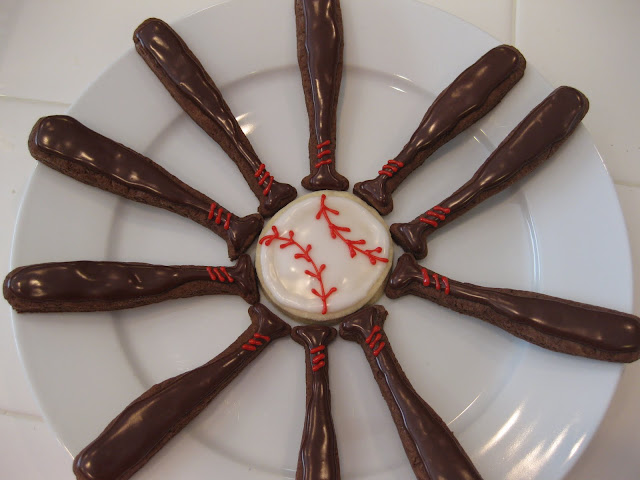 The bats are chocolate cookies with chocolate icing. I give you instructions if you want vanilla cookies like the baseballs are made with.