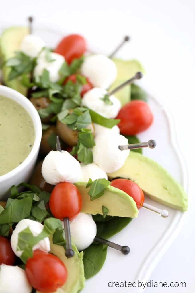 Making a simple appetizer for a small or large gathering doesn’t need to be complicated. Gathering the items and adding fresh herbs is always a great addition. Add a homemade sauce (like my green goddess dressing if balsamic isn’t your favorite)and in minutes you’ll have a tasty snack. Food picks are a great way to allow for easy grabbing!