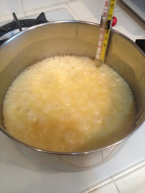 - Boil butter and sugar until it reaches 298 degrees on a candy thermometer.