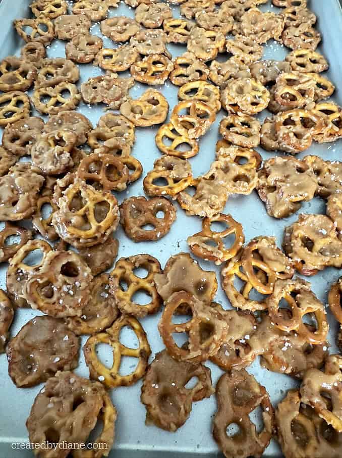 - In a large bowl or on a baking sheet. Pour the hot toffee over the pretzels, stir to coat the pretzels. Then separate with two forks so the toffee firms up without it being in a large lump.