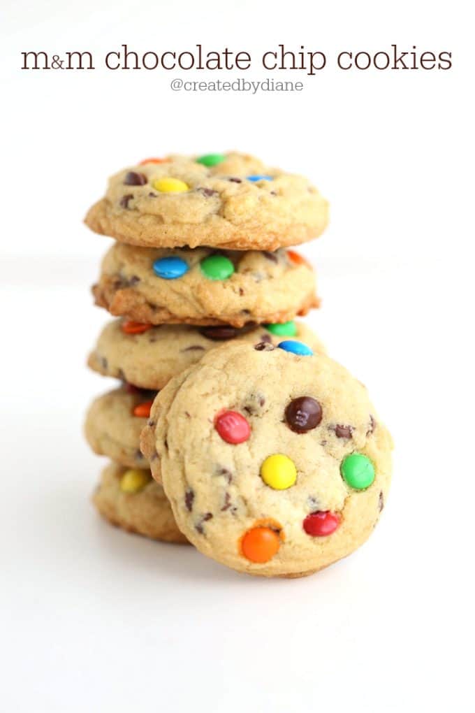 These have mini chocolate chips inside them and I made the cookies with a 2 tablespoon scoop.Not too big and not too small, but perfect for mini m&m’s and mini chocolate chips!