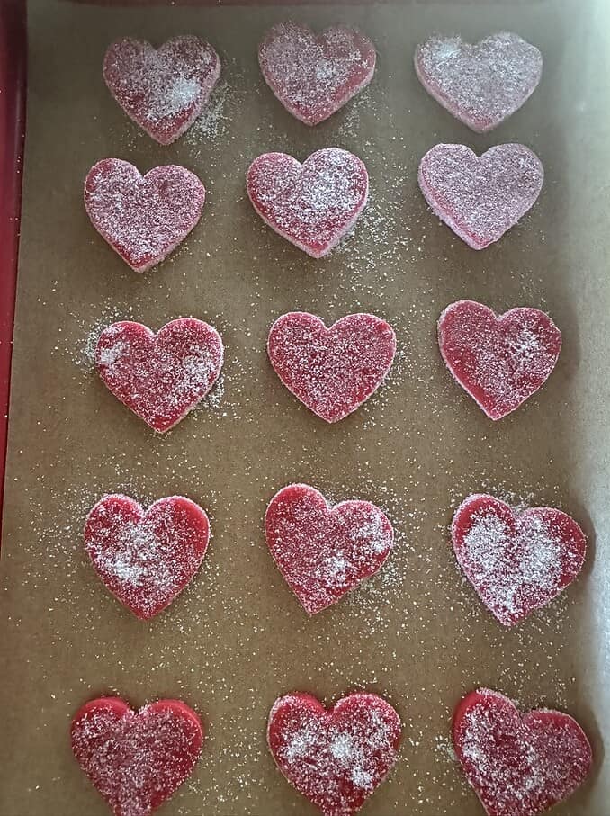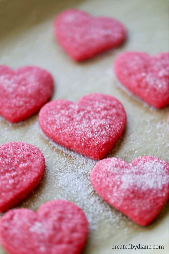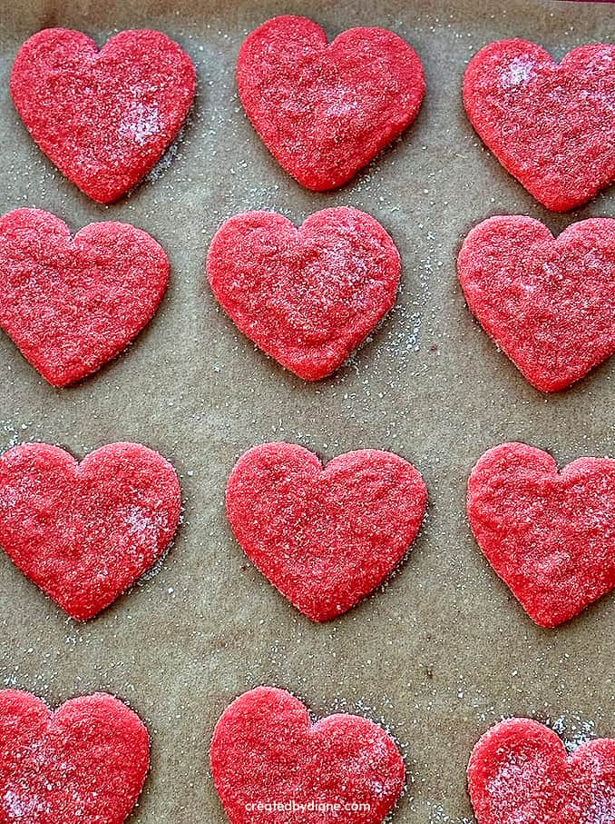 sugar coated red heart cookies, you choose roll them thin for crispy cookies, or thicker for chewy cookies. This small batch recipe is perfect for a quick baking moment.