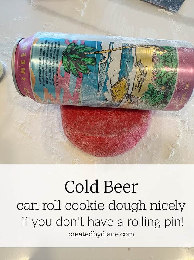 Funny story… we’ve been camping, and I forgot to pack a rolling pin, so I had minimal options within reach… and a cold 16oz beer can was the perfect item, I floured it like I would a rolling pin, and the coolness kept the cookie dough nice and smooth!