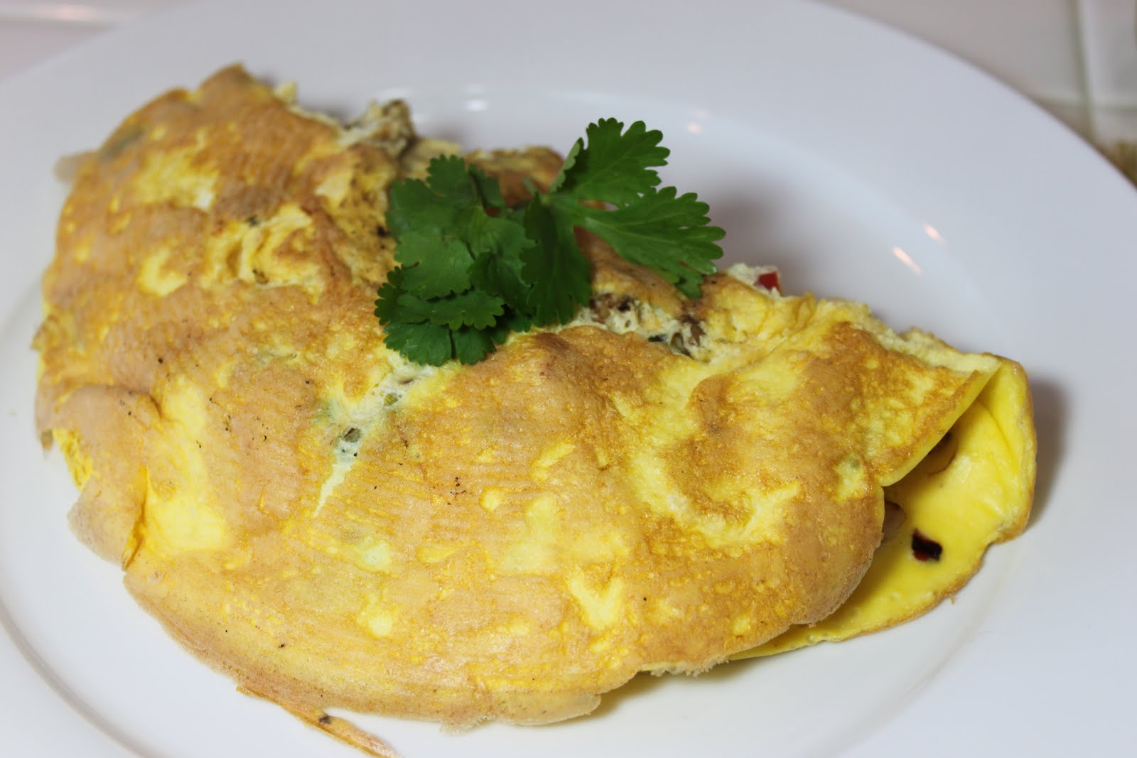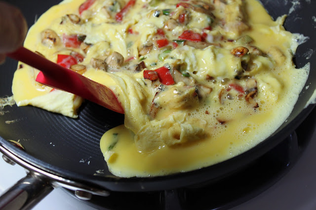 Today’s omelet was made with scallions, red pepper, and mushrooms.