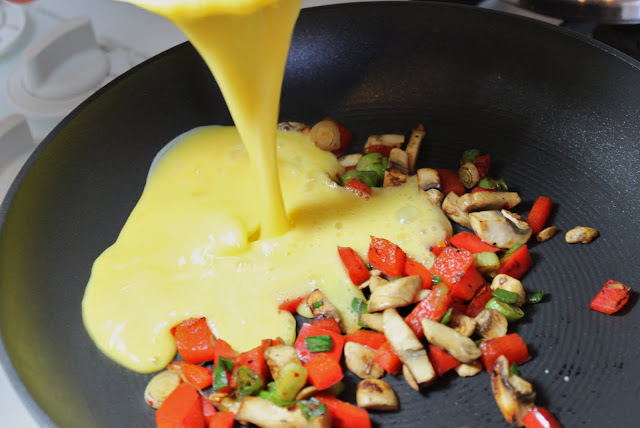 I mix three eggs with about 3 tablespoons water and pour them on top of the veggies that I lightly cooked.