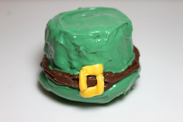 I took a cupcake out of the cupcake wrapper and dipped the entire cupcake into green candy melts, that had been heated throughly. Then placed the cupcake upside down to dry. I trimmed it with chocolate buttercream frosting and the yellow buckle is white buttercream tinted gold.