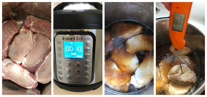 Place the pork chops in the pressure cooker with chicken broth and soy sauce, set the timer for 15 minutes and then you can either allow the pressure to release on its own or release the steam. (the photo says 10 minutes, I forgot to take the photo when I started and made the recipe twice to be sure of the timing)