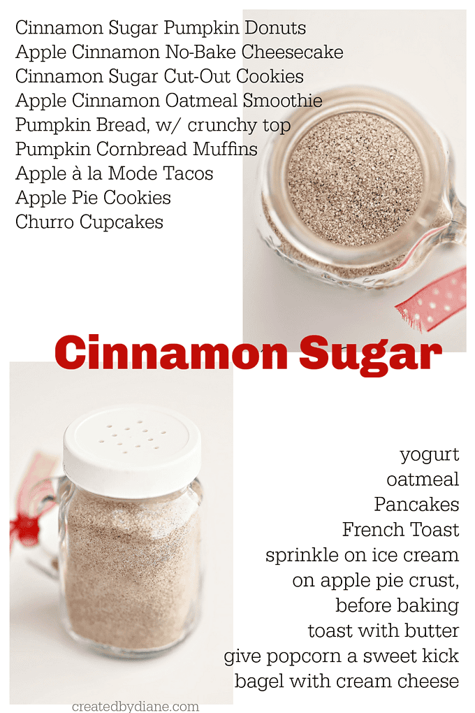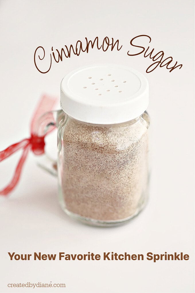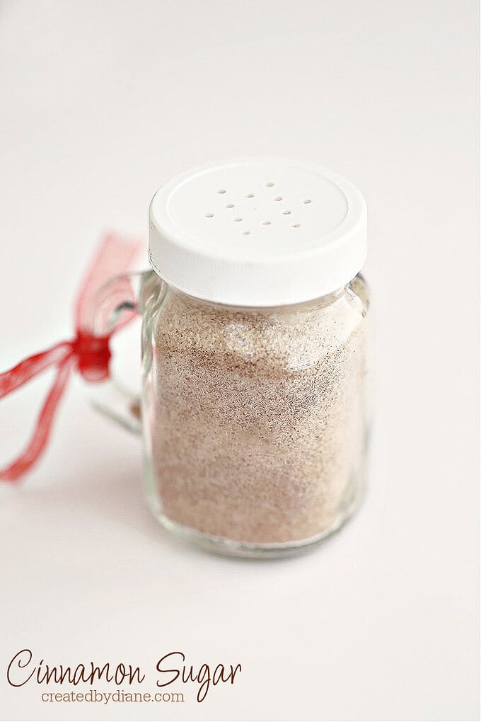 - You can easily multiply the cinnamon sugar for how much you'd like. Select a jar for the amount you'll be making, having a shaker top is extremely helpful.
