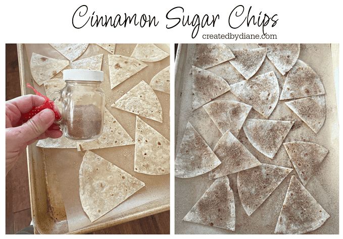 Then shake on the cinnamon and sugar on both sides of the tortillas. Then place them in a 400° oven and bake them until crisp. You can turn them over with tongs to be sure each side is crisp.
