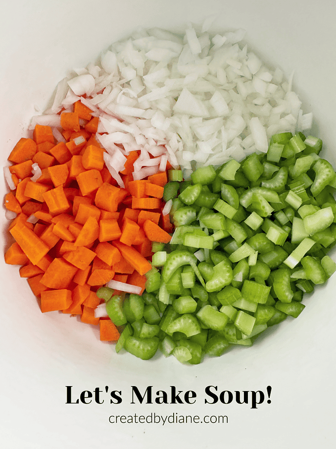 Like most soups, this one starts with a mirepoix. Carrot, onion, celery. Keeping all of them diced the same size will ensure they cook evenly.
