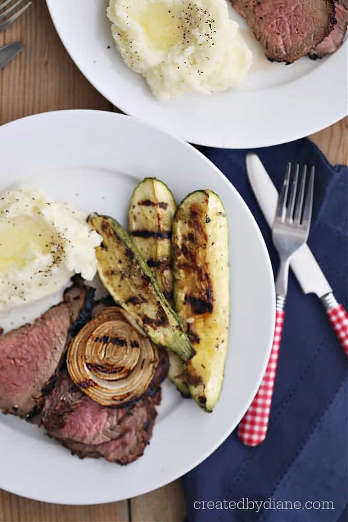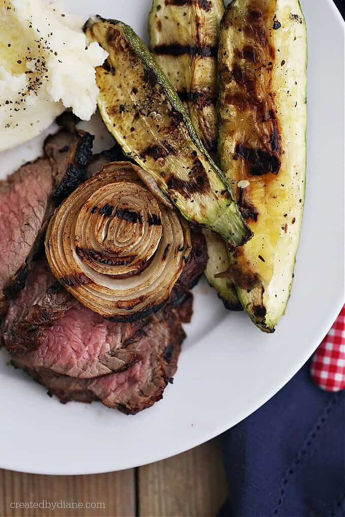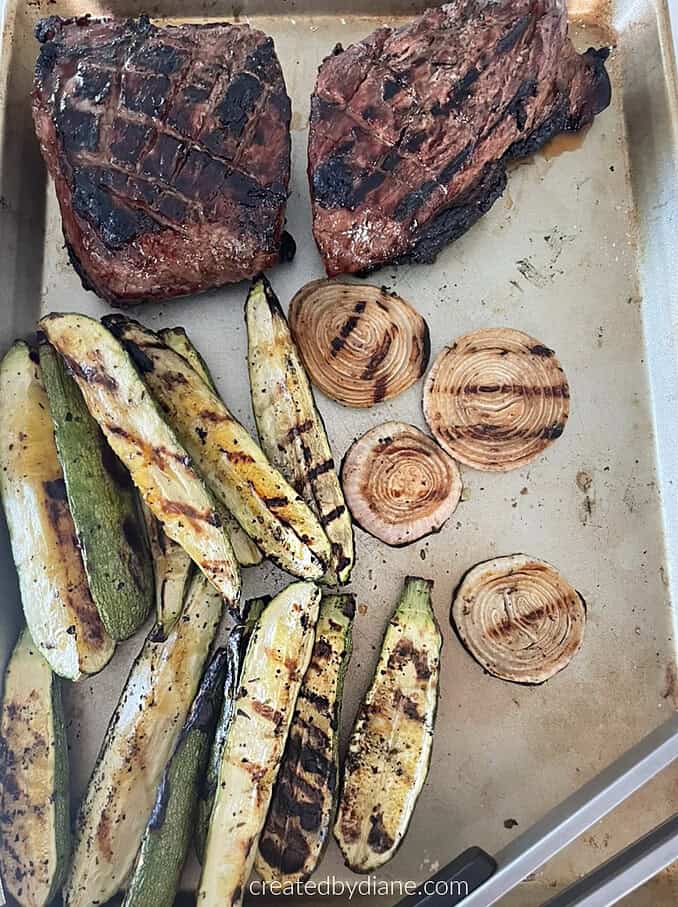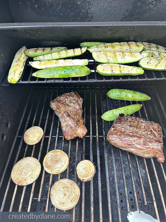 - Heat the grill until over 400 degrees° then place the meat on the grill and sear it on both sides, grill for a few more minutes. Add the sliced onion and zucchini or desired vegetable.
