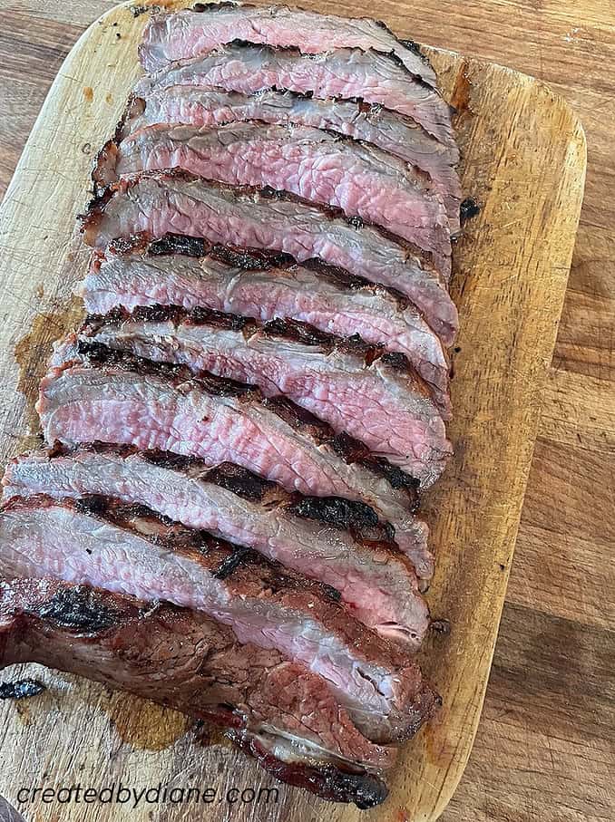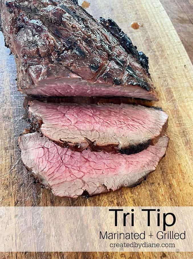 I like my tri-tip medium rare. I remove it from the grill when it’s 135°. Then I place a piece of foil over the top as it rests for 10 minutes. Slice and serve.