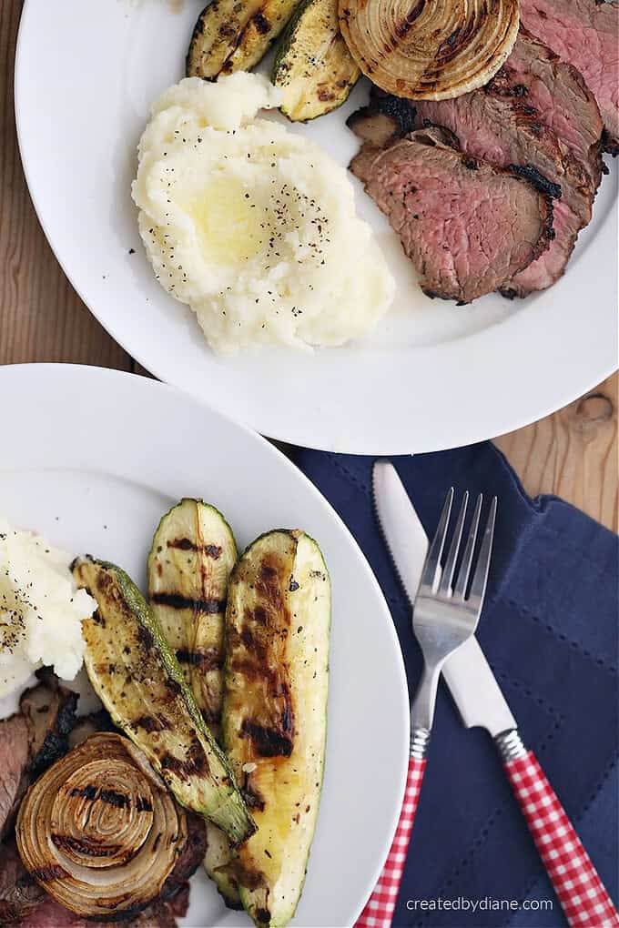 - Heat the grill until over 400 degrees° then place the meat on the grill and sear it on both sides, grill for a few more minutes. Add the sliced onion and zucchini or desired vegetable.