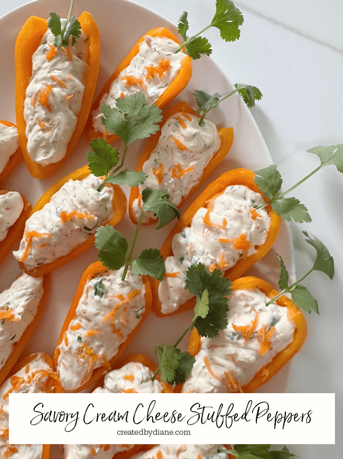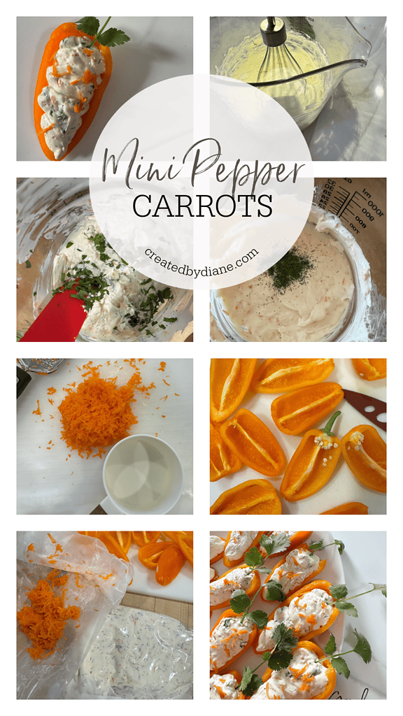 These savory mini peppers are stuffed with herbed cream cheese. They look like carrots and make that garden theme come to life. They are the perfect snack and appetizer for parties, Easter, and baby showers. Add some to a charcuterie board to feature some spring and summer flair!