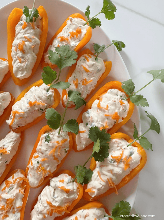 • Use mini orange sweet peppers, slice them in half, and fill them with the veggie cream cheese mixture.